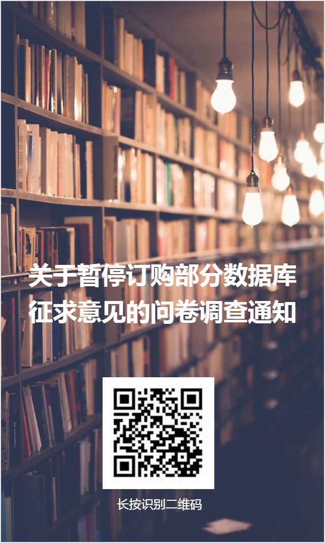Due to the shortage of this year's document resource construction fee, part of the database will have to suspend the order. Now through the form of questionnaire, on whether part of the database will be temporarily suspended next year, to carry out research for the whole school, to solicit the opinions and Suggestions of readers, to provide reference and basis for scientific decision-making.