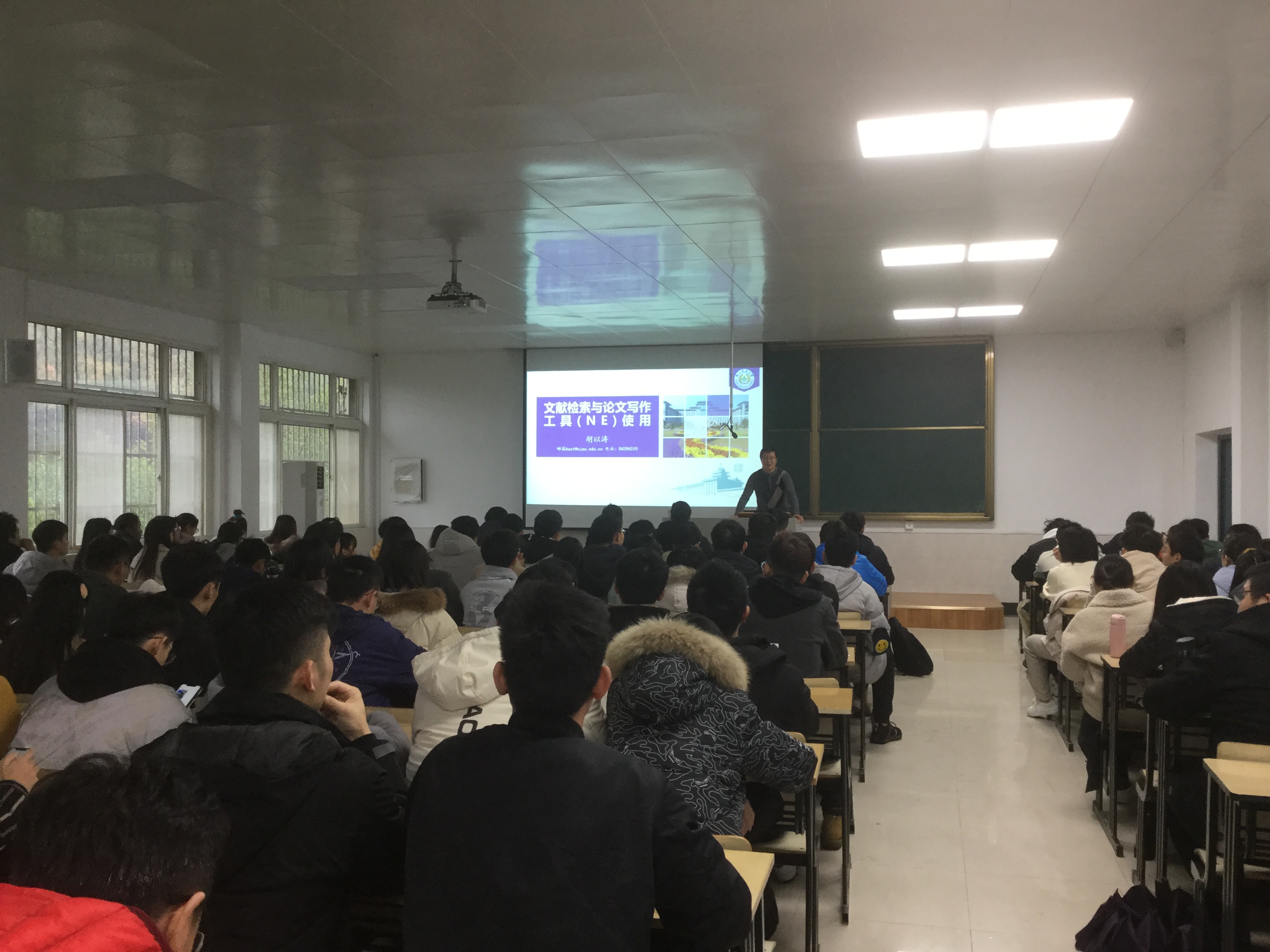 Hu Yitao introduced the use of literature retrieval and essay writing tool (NE) from three aspects. Firstly, the basic concept of literature and the purpose and process of literature retrieval are popularized. Then, it introduces the list of database purchased by our university, and takes CnKI as an example to demonstrate the application of advanced search and Boolean logic. In the essay writing tool, 7 steps of NoteExpress are introduced emphatically. Finally, in terms of literature acquisition, the platform of Jiangsu Engineering Literature technology Center cooperating with our school was recommended to the students.