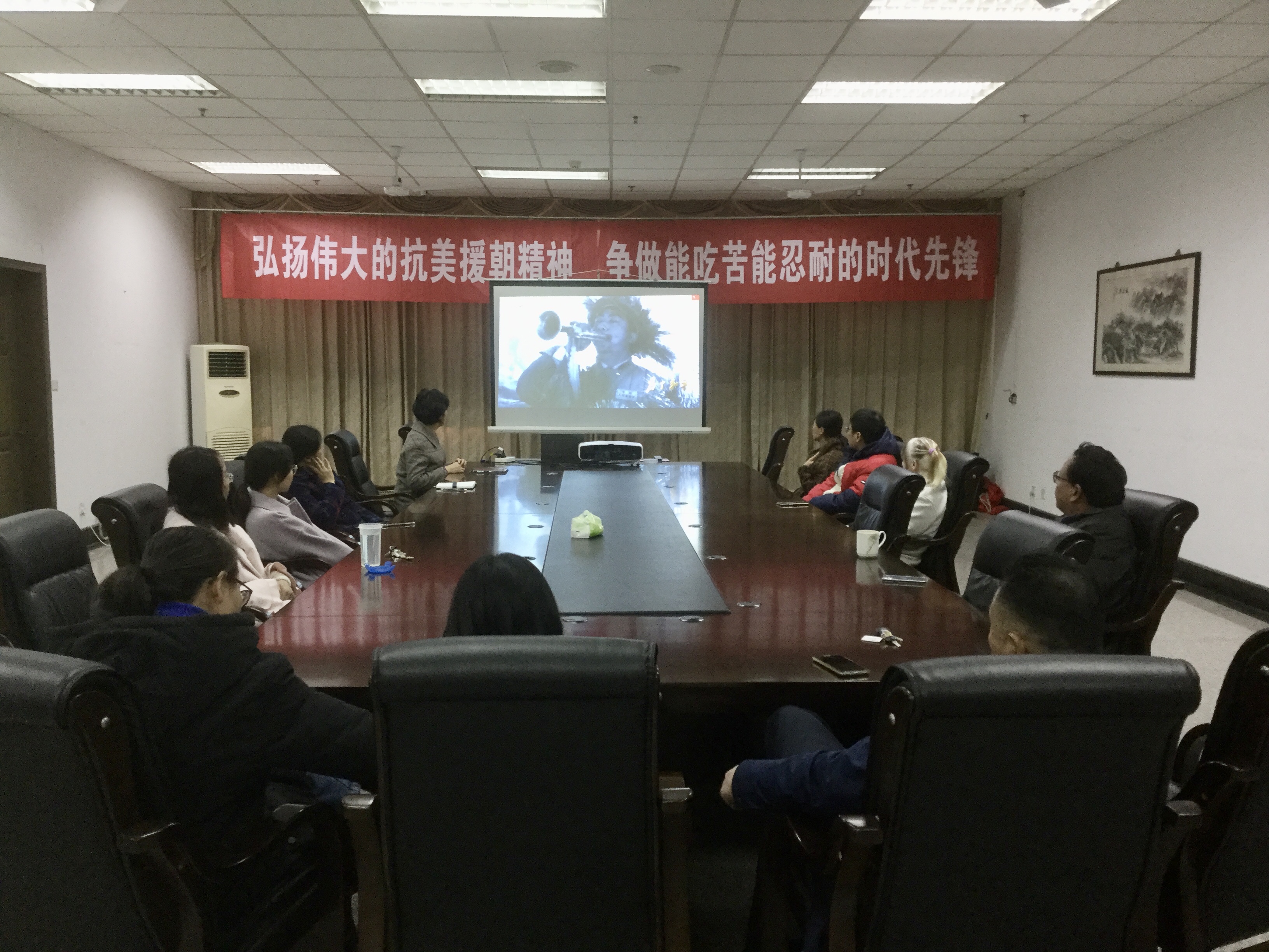 On the afternoon of November 30, all Party members and activists watched the third episode of the large-scale documentary "for peace" -- blood burst "in conference room 310 of the library. Why can our volunteer army keep on going forward and be desperate? Why is the Korean battlefield so hard, so dangerous and so cruel? Why can the Chinese people's Volunteer Army live fearlessly and fight to the end! It depends on the blood and soul of the volunteers. Qi De, former Vice Minister of the Military History Research Department of the Academy of Military Sciences, said that the first reason is the strong leadership of the party; the second is the quality of our soldiers, who are brave enough to go forward and form a situation of overwhelming all the enemies without being succumbed to by the enemy. Volunteers have a special ability to fight with blood.