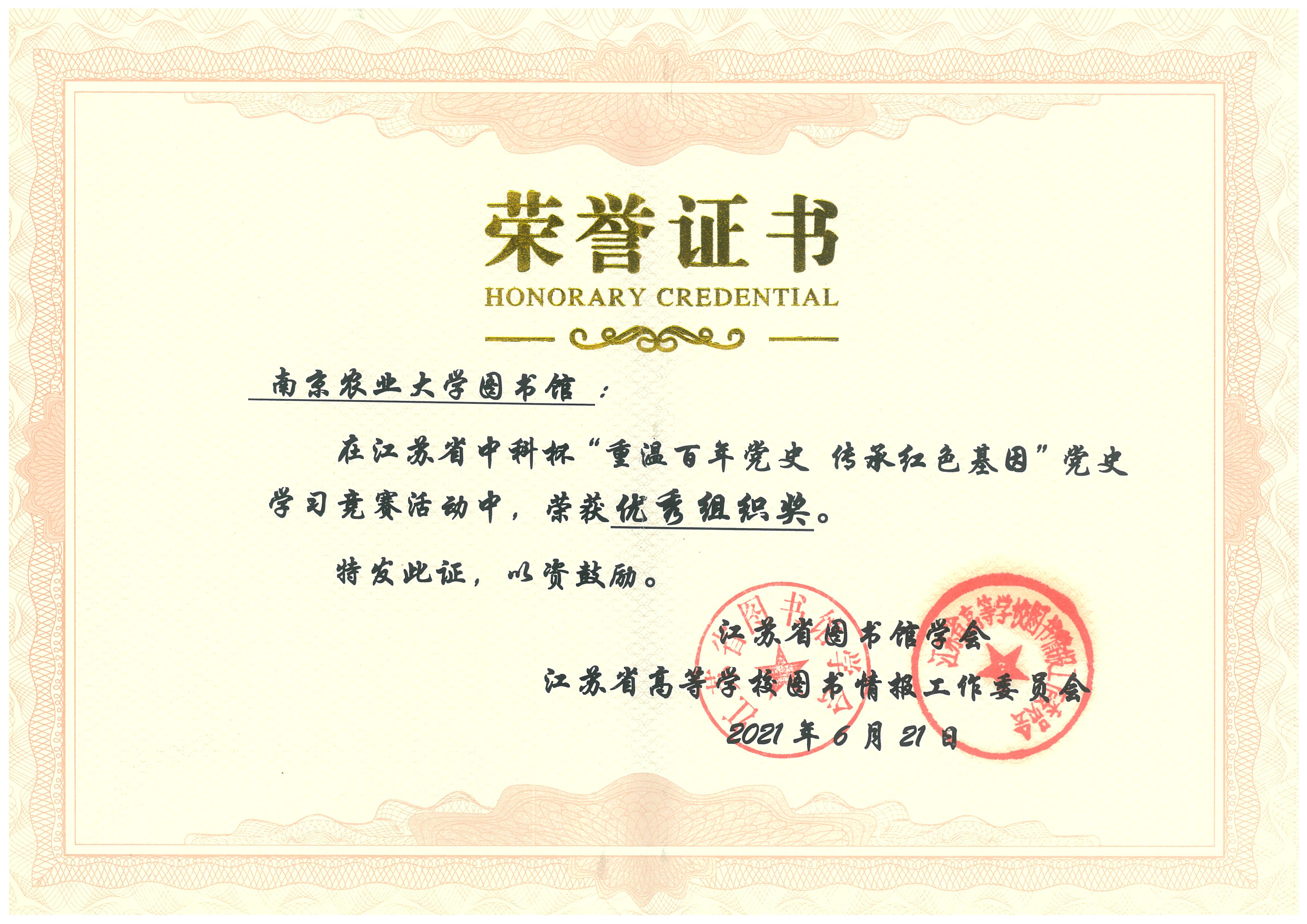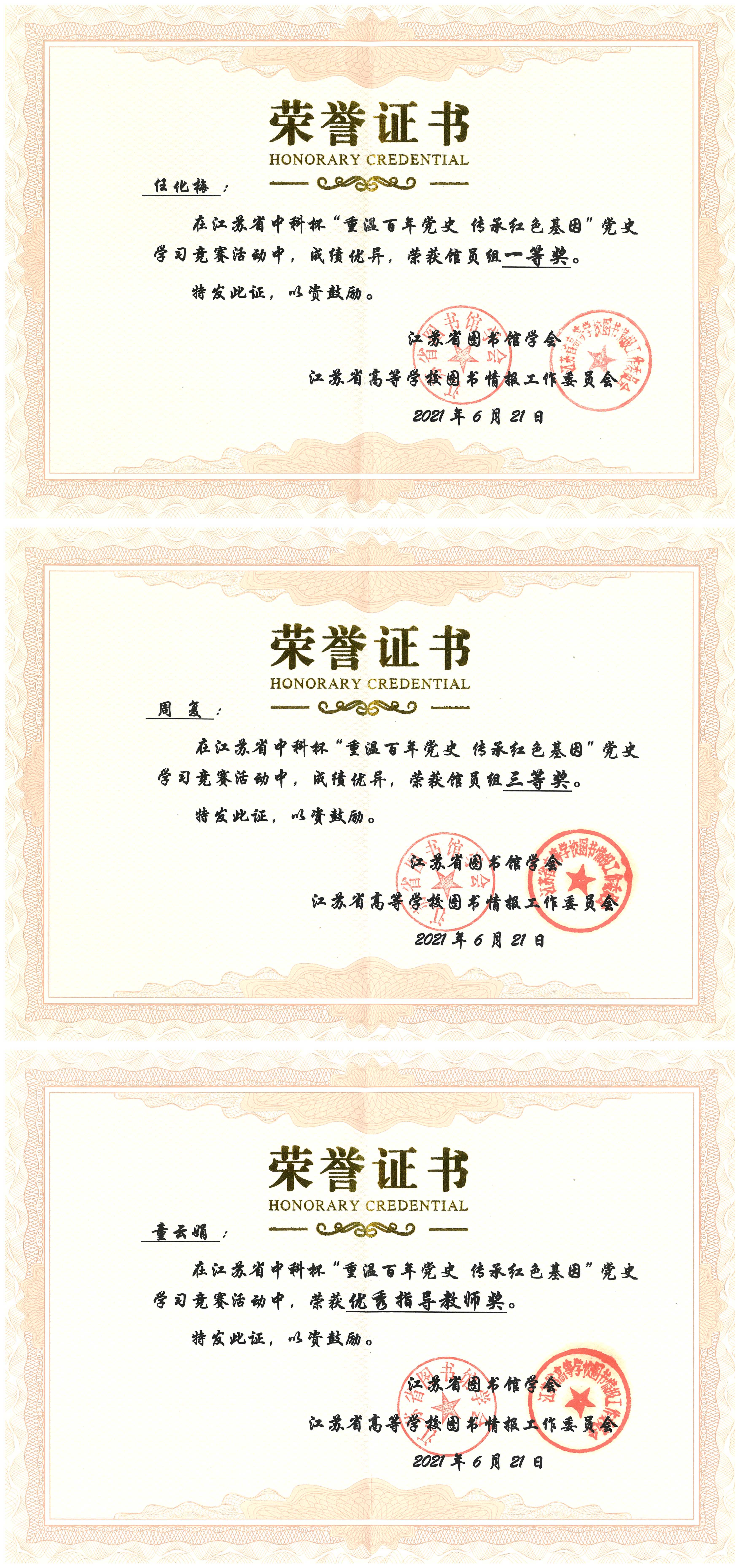 The "Revisiting a Century of Party History and Inheritance of the Red Gene" Party History Knowledge Contest was jointly organized by the Jiangsu Library Association and the Library and Information Work Committee of Jiangsu Higher Education Institutions. A total of more than 26,000 people from 96 units in the province participated in the contest. Readers of our school were awarded: 1 first prize, 1 third prize, 2 outstanding prizes in the librarian group, and 3 outstanding prizes in the student group. 7 people were shortlisted for the award. Among the participating units, our school library won the "Best Organization Award", and Mr. Tong Yunjuan won the "Outstanding Instructor Award".