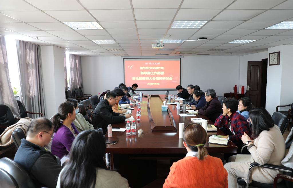 On the afternoon of March 3, the library (Cultural Heritage Department) held a seminar on work deployment for the new semester and the implementation of the spirit of the school-wide teacher conference in A705. All library leaders, department directors and branch secretaries of the library (cultural heritage department) attended the meeting. The meeting was divided into two parts: work deployment and discussion, which were presided over by the director (minister) Ni Feng and the secretary of the general branch Zhu Shigui.