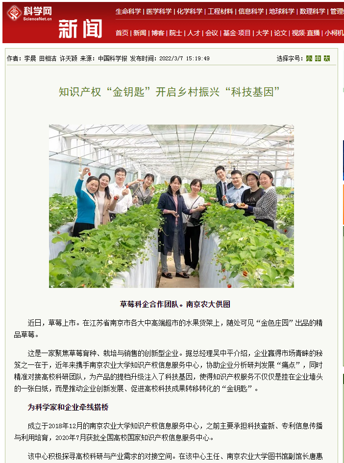 The case of Nanjing Agricultural University Intellectual Property Information Service Center providing intellectual property information service for Nanjing Golden Manor Agricultural Products Co., Ltd. was published on March 2nd and March 7th on the special editions of [China Intellectual Property News] and [China Science News].