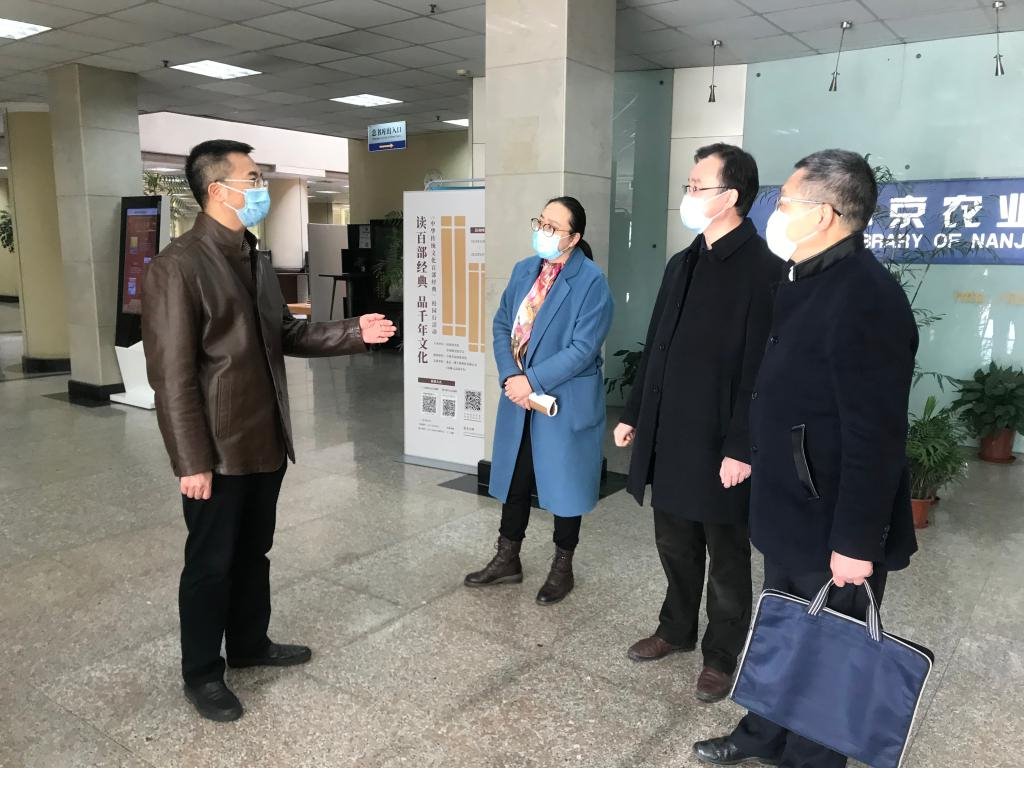 On March 23 and 25, Nanjing Agricultural University President Chen Fadi, Vice President Yan Xianglin and others came to the library (Cultural Heritage Department) Weigang Campus Library and Pukou Campus Branch Library to inspect and guide the epidemic prevention and control work. The library (Cultural Heritage Department) Party branch secretary Zhu Shigui, deputy directors (deputy ministers) Zhang Kun, Kang Min and others accompanied the inspection.