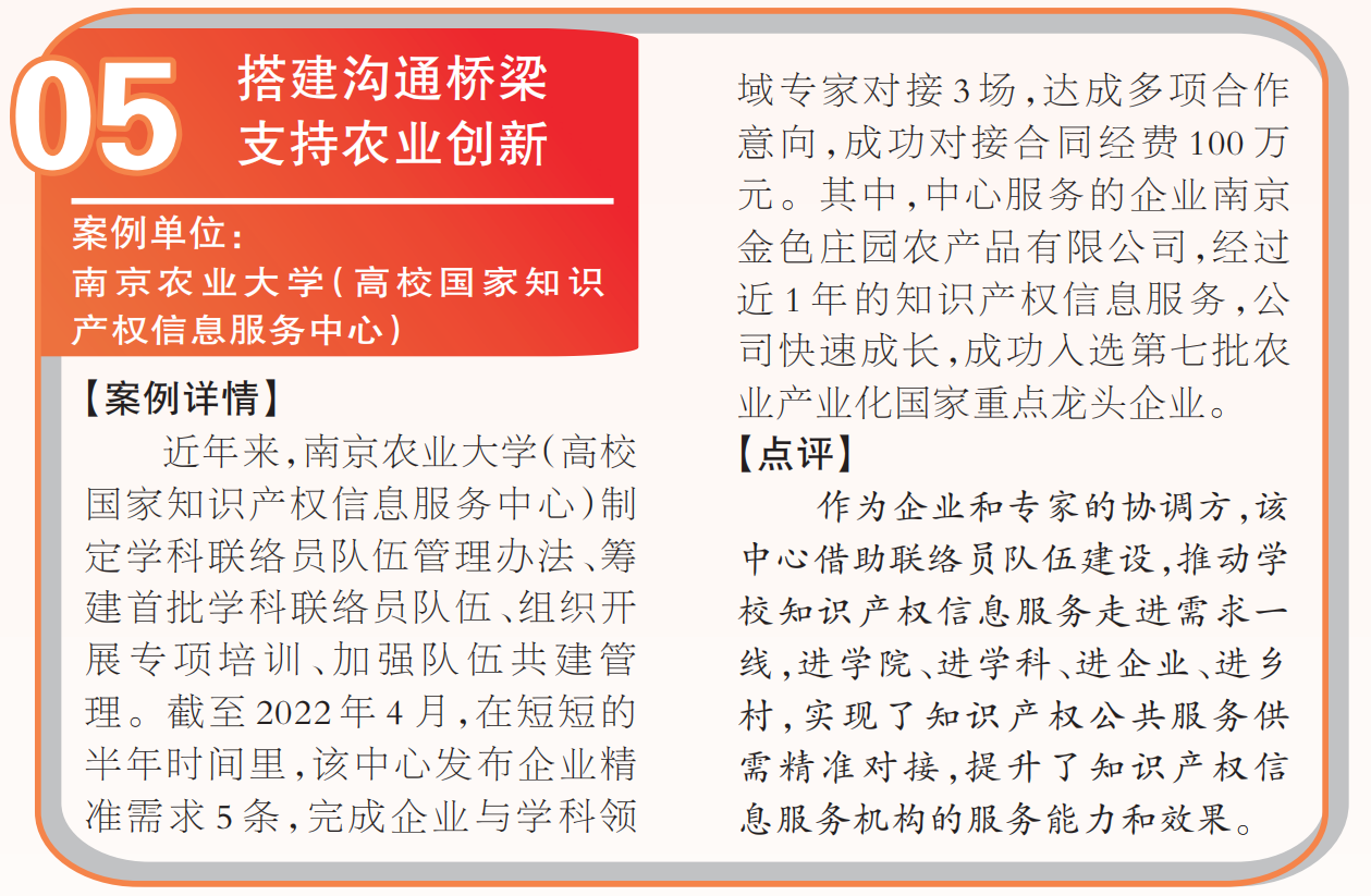 On April 27, "the first batch of outstanding cases of national intellectual property information service in 2022" was published in the special edition of China Intellectual Property News. Ranked fifth in the case, our center is the only selected intellectual property information service center in agricultural colleges and universities.