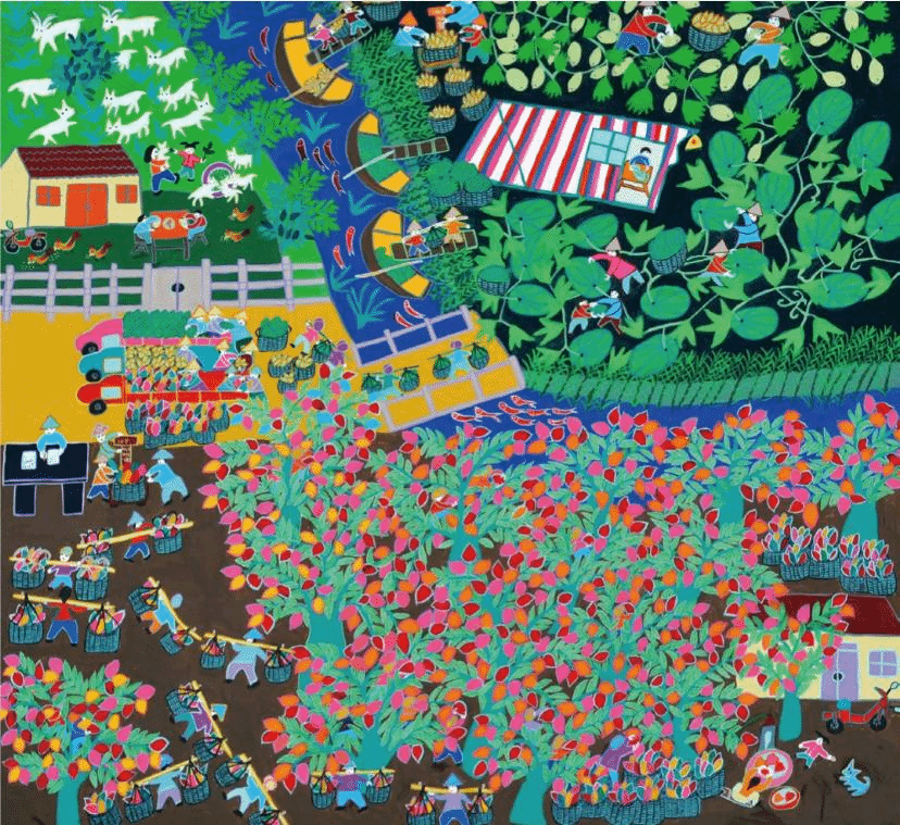Peasant painting is a kind of popular painting. It is a traditional folk art with a strong mass basis. It is a painting and print painting made and appreciated by farmers. It has a peculiar style and exaggerated techniques, and has the reputation of Oriental Picasso . The paintings exhibited in this exhibition are 60 excellent works carefully selected by the expert group after research, discussion and careful selection. Peasant painters from six painting villages in Nanjing, Xuzhou, Nantong, Huai'an, Yancheng, Zhenjiang and other provinces, through profound themes, simple The bright style, flowing lines and bright and generous colors outline the development process of realizing rural revitalization and cultivating rural culture in the new countryside in the new era under the correct leadership of the party, showing the simple and beautiful life of the peasants. Beautiful and moving rural scenery, quiet and comfortable farm life, lively labor scenes, joyous festival celebrations... Images full of rich and warm rural atmosphere and distinctive local characteristics are vividly displayed on the paper, showing the uniqueness of farmers' paintings. Some styles and characteristics fully reflect the development achievements of "strong, rich, beautiful and high" rural culture construction in new Jiangsu.
