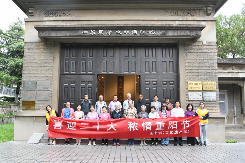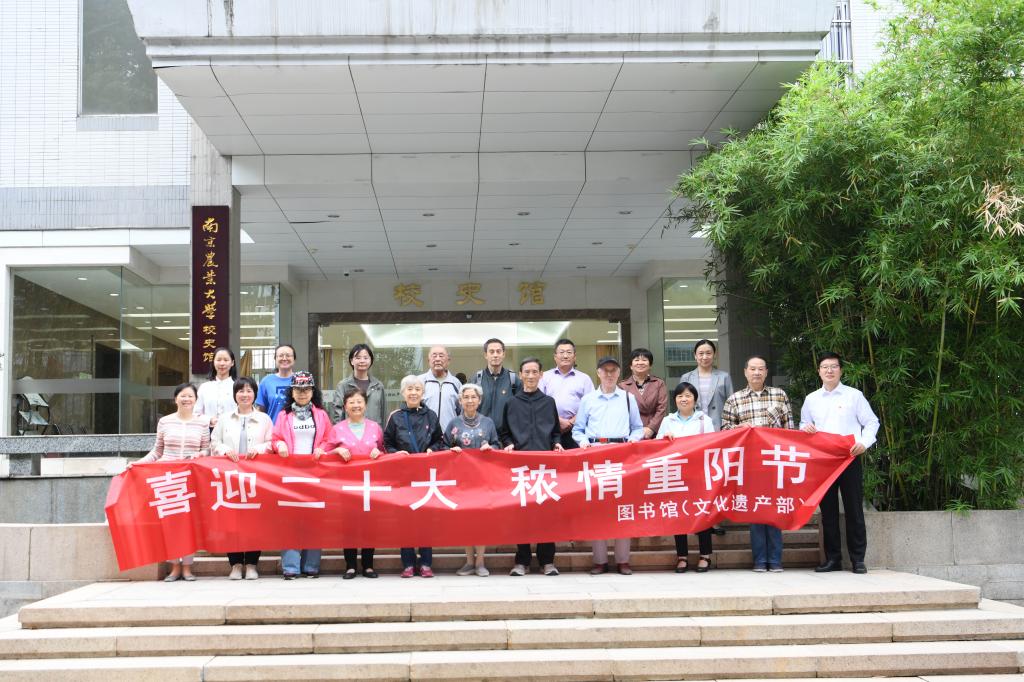 Every year Chongyang, now Chongyang again, the yellow flowers everywhere are particularly fragrant. On October 4th, on the occasion of the Double Ninth Festival on September 9th, when the whole country welcomed the victory of the 20th National Congress of the Communist Party of China and the 120th anniversary of Nanjing Agricultural University, the General Party Branch of the Library (Department of Cultural Heritage) organized the "Welcome Two Tenth Ten, Nongqing Double Ninth Festival" Party Day Activities, Party Branch Secretary Zhu Shigui, Deputy Director (Deputy Minister) Tang Huiyan, Party Branch Members Zhang Kun, Li Xinquan, Hu Yitao, on-the-job volunteer service members of various departments and dozens of retired seniors Comrades participated in the event.