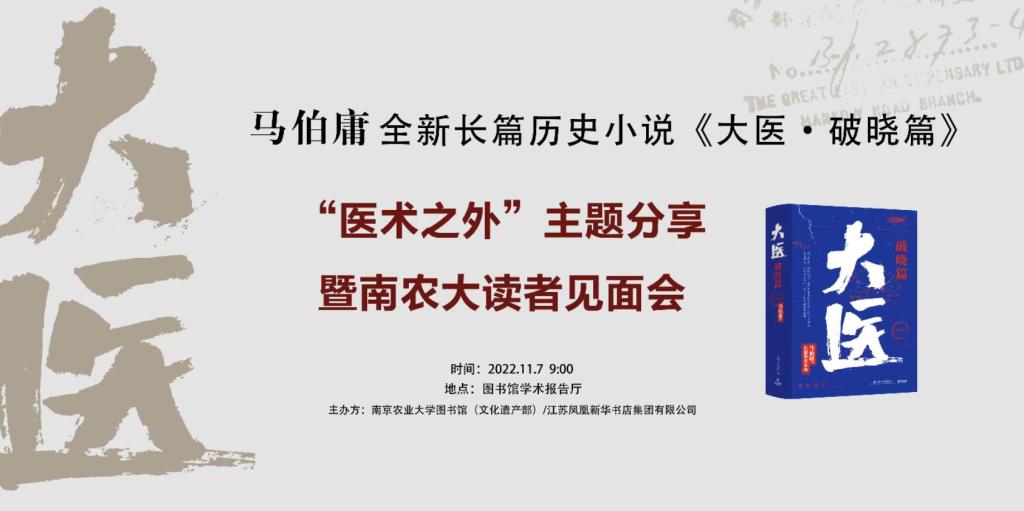 Mr. Ma Boyong, winner of the People's Literature Award and Zhu Ziqing Essay Award, and author of best-selling books such as "The Twelve Hours in Chang'an", "Da Ming under the Microscope" and "The Middle Game of Antiques", will bring his latest masterpiece "The Great Doctor: The Breaking of Dawn" to Nanjing Agriculture University, meet the readers of our school.