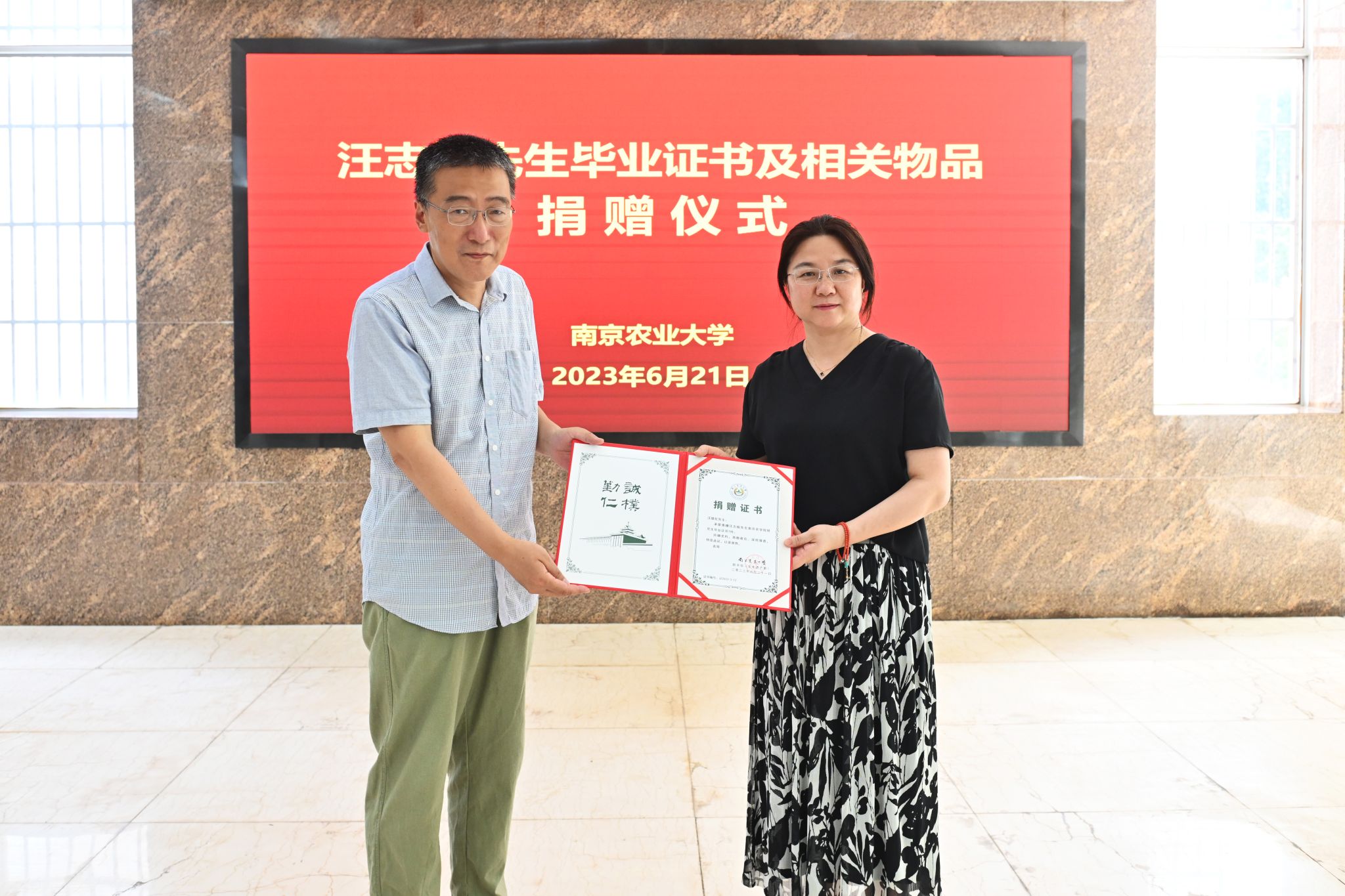 At the donation ceremony, Mr. Wang Dehua donated Mr. Wang Zhikai's graduate certificate to the school. Guo Zhongxing, the director of the library and Minister of Cultural Heritage, represents the school in receiving graduation certificates and other items. Jiang Yan, Secretary of the Party Committee of the School of Animal Medicine, presented a donation certificate to Mr. Wang Zhikai's family on behalf of the school.