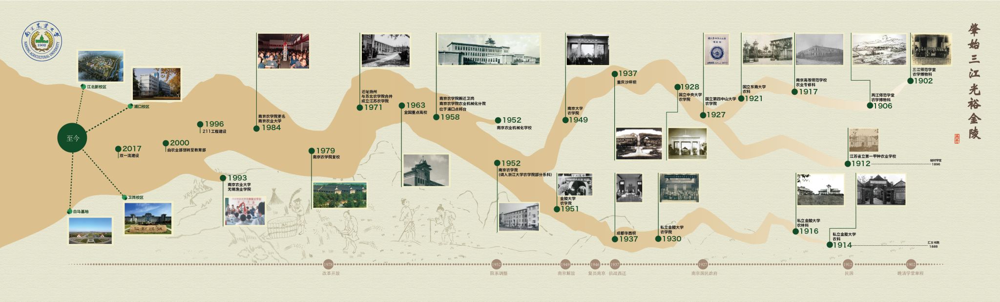 The first is to add the "Picture Scroll of Sanjiang Guangyu Jinling at the Beginning". This picture scroll comprehensively displays the continuous development process of Nanjing Agricultural University over the past 120 years. The design of the scroll takes the meaning of "Three Parallel Rivers". On the historical axis of the late Qing Dynasty, the Republic of China and New China, with the Yangtze River as the main line and landmark buildings or major events on campus in different periods as markers, it shows Nannong's gradual progress from the three founding sources. The process of merging forms a magnificent and timeless picture. "Zhishi Sanjiang" means the starting point of agricultural science and natural history of Sanjiang Normal School and the land of Southeast Wu and Vietnam, and "Guangyu Jinling" means the starting point of agricultural science of Jinling University and the ancient capital Jinling, the main place of education. The scroll is located on the exhibition wall of the middle hall of the school history museum.