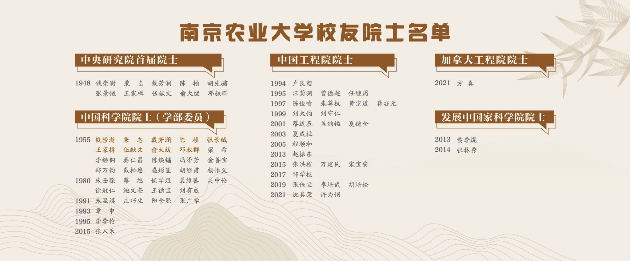 Fourth, a new alumni and academician exhibition board was added. A total of 65 teachers and students from Nanjing Agricultural University and its predecessor were elected to the list of first academicians of Academia Sinica, members of the Chinese Academy of Sciences, academicians of the Chinese Academy of Sciences, academicians of the Chinese Academy of Engineering, academicians of the Canadian Academy of Engineering and academicians of the Academy of Sciences of Developing Countries. The alumni and academician exhibition board is located on the southwest side of the school history museum. The biographies of the alumni and academicians are displayed on the academician wall in the library reading room and the figure exhibition of each department in the school history museum.