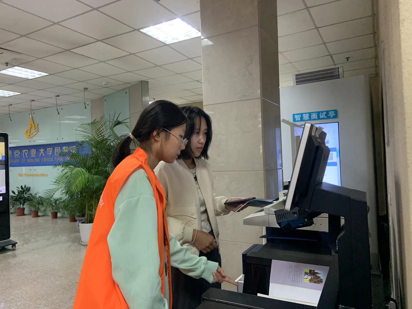 Volunteers guide new students to use the self-service borrowing and returning machines