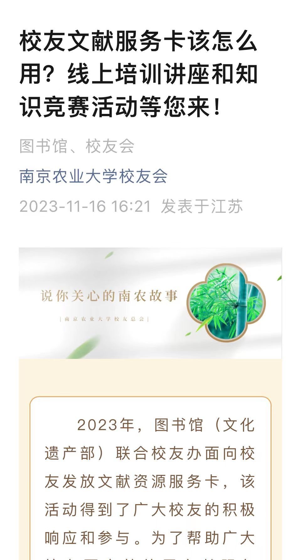 Since June this year, the library (Cultural Heritage Department) and the Alumni Office have issued literature resource service cards to alumni 5 times, totaling 1,750. This activity has received positive responses and enthusiastic participation from the majority of alumni. In order to help alumni use the document service card more efficiently, the library (Cultural Heritage Department) held an online training lecture and online knowledge competition at 19:30 on November 17.