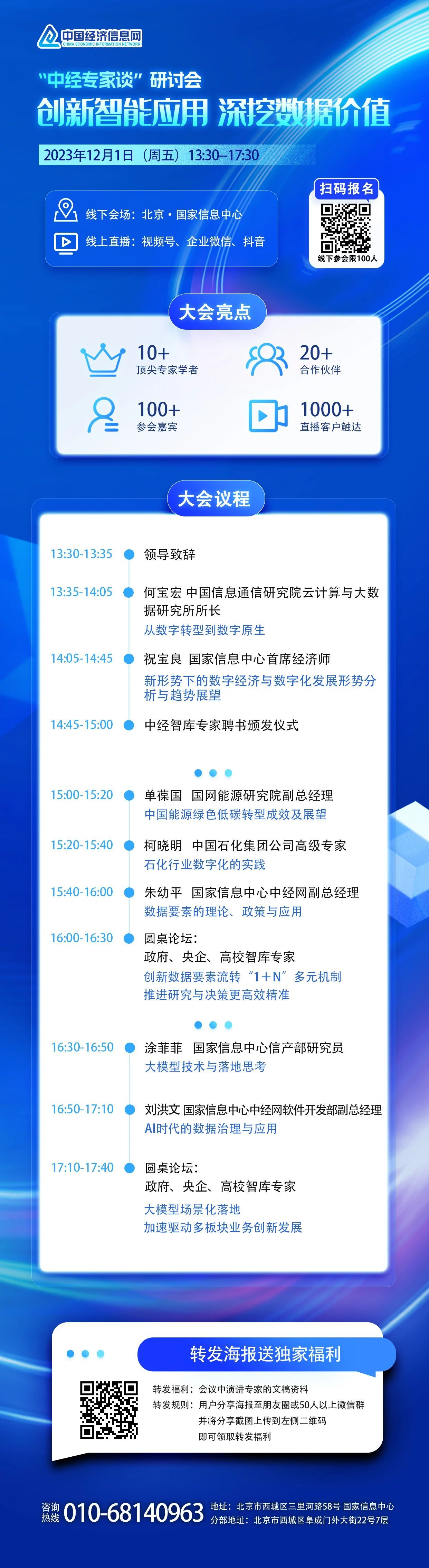 The National Information Center China Economic Network will hold the "'Innovative Intelligent Application to Deeply Explore the Value of Data' Seminar" on December 1, 2023 (Friday) from 13:30 to 17:30.